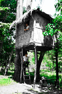 This Bahay Kubo is cute! It has a shape of cubic that's made of wood, planks, bamboo and large logs. They made it this high because it's attached to the tree.